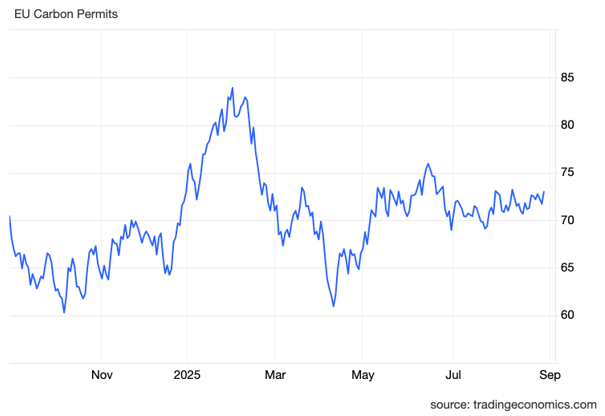 EU carbon allowance prices were steady through the summer: in July, EUAs hovered in the €70s/t, and in August, they held around €72/t, edging higher but still in a tight range. Desks cited muted industrial demand, renewables output, auction supply, and the seasonal power stack as key near-term drivers. With the first maritime ETS surrender due at the end of September, several analysts had anticipated a steeper pre-surrender bid. So far, that additional compliance demand is visible but not yet forceful enough to break the range.