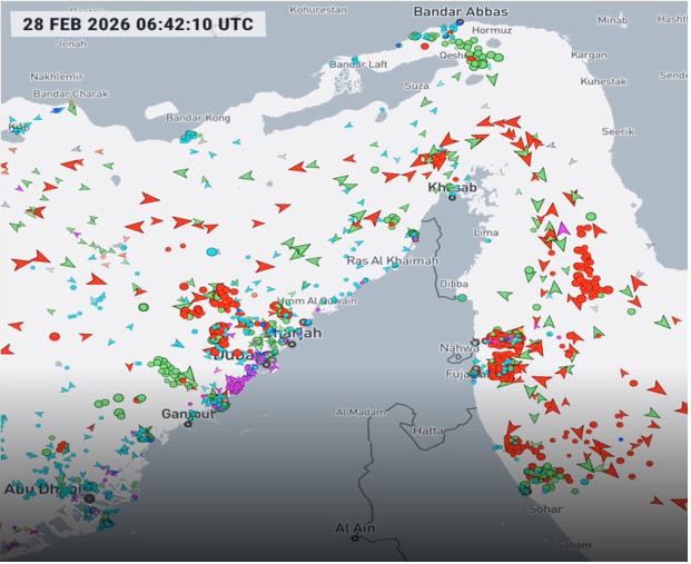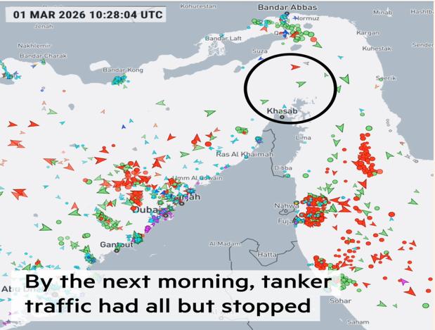 Let’s address the concerns related to oil prices (it should be noted that LNG prices will also be affected). We have seen analyses explaining that oil prices could reach over $100 a barrel. We don’t subscribe to those views. We believe that chances are that oil prices will spike 8-12% (placing the WTI around $74 and the Brent around $81), but when the situation normalizes, there are reasons for prices to settle. The reasons for this kind of medium price spike are as follows: First, OPEC+ already announced higher production quotas (of course, the question is if those higher production levels could reach the destinations given that the Strait of Hormuz – from where 20% of global oil shipments pass – is practically closed, not necessarily by Iran but by the shipping and insurance companies themselves, as shown below.) If the closure lasts up to 10 days, then the impact would not be significant. However, if the closure is prolonged (which we don’t think will be the case), then the chokepoint of Hormuz could drive oil prices to the north of $95 for both WTI and Brent. Even worse, if Iran chooses to weaponize oil by targeting oil infrastructure facilities (refineries, oilfields, and export terminals), then we should not be surprised that such escalation not only drives oil prices well above $120, but also endangers an escalation beyond Middle East grounds.